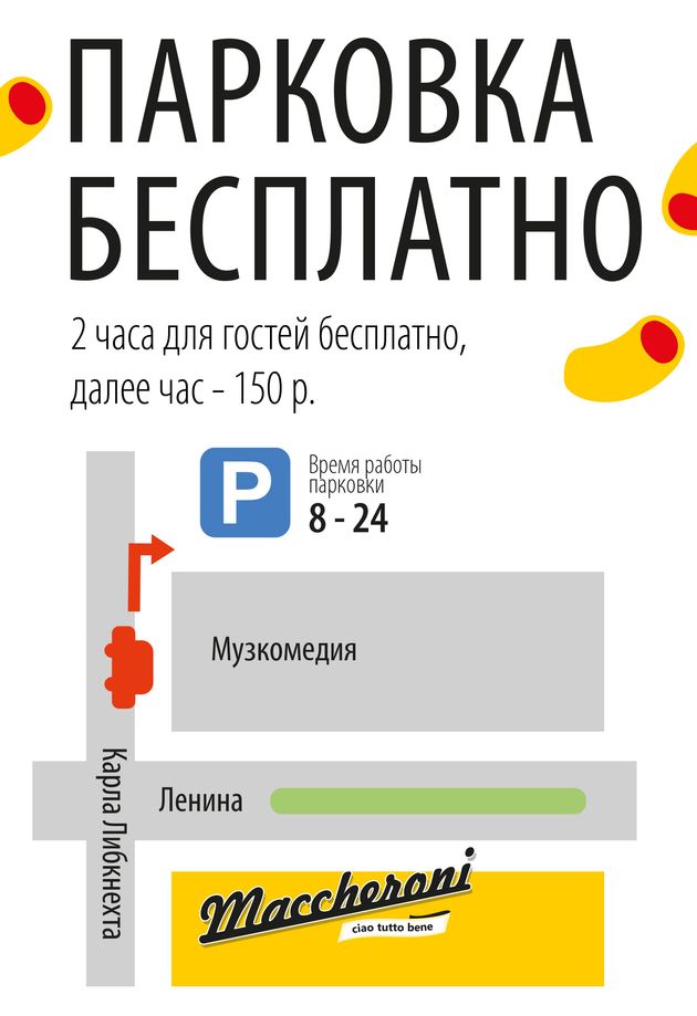 Для гостей Maccheroni есть парковка за Музкомедией! Два часа бесплатно, далее час - 150р. С 8-00 до 24-00. До встречи в Maccheroni!